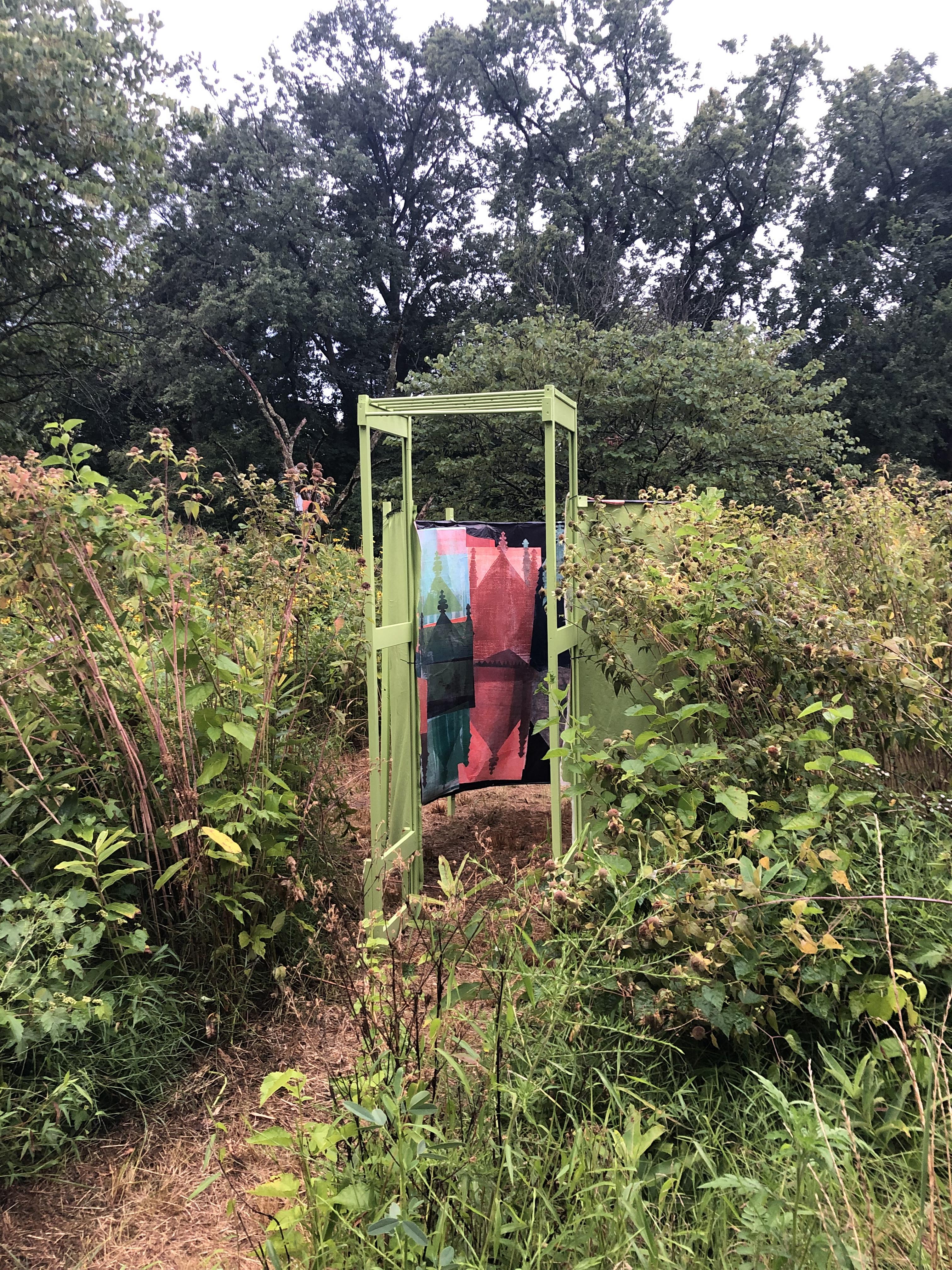 Tucked at the end of a path in the tall meadow, Mo(u)rning Mourning provides a place to pause, reflect on your own thoughts or let your mind wander inspired by the colorful imagery inside.