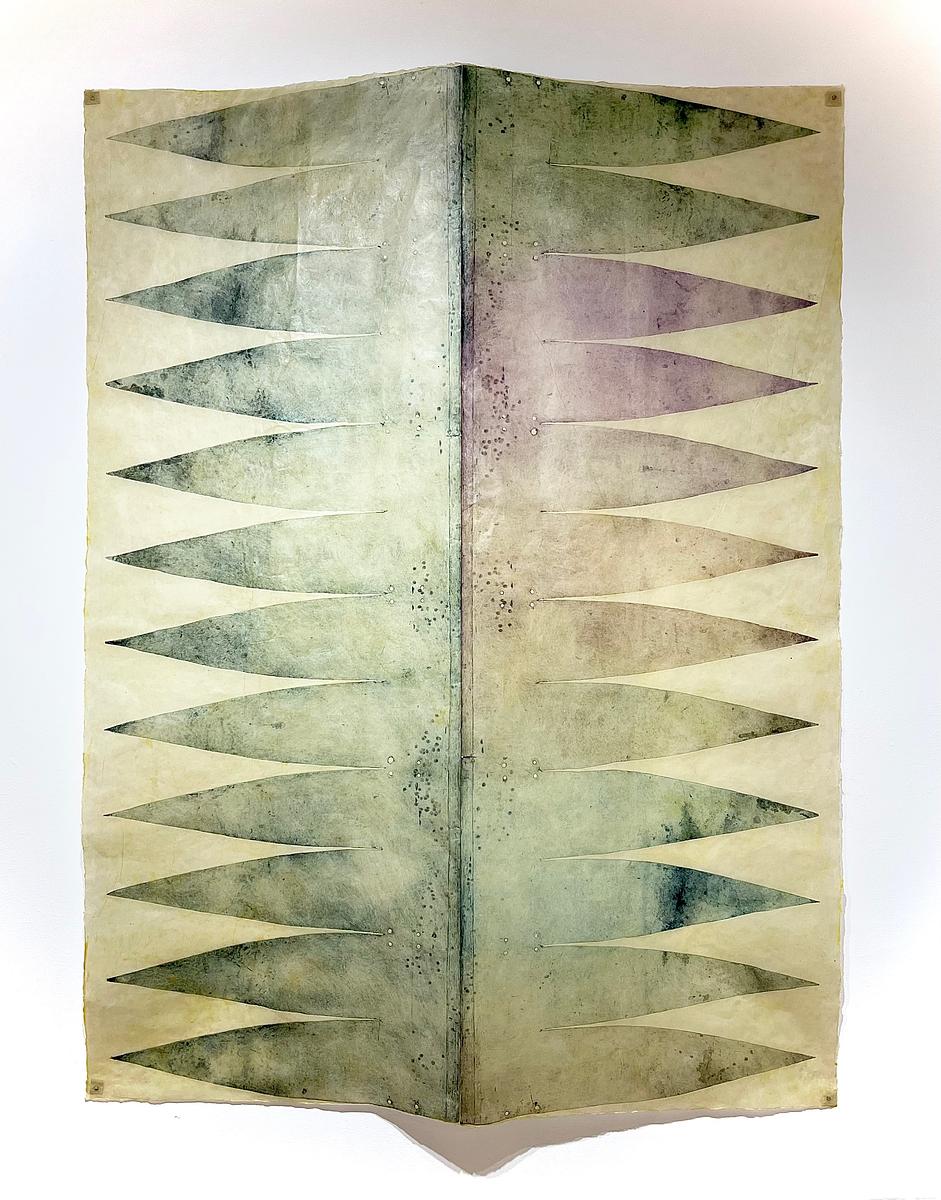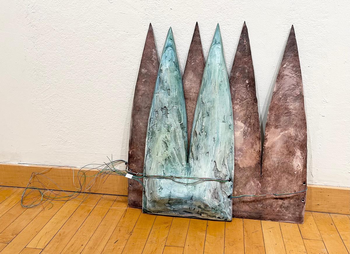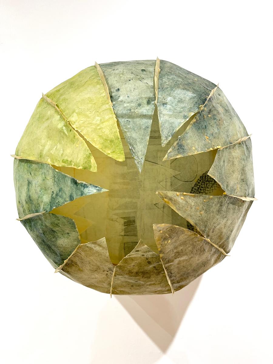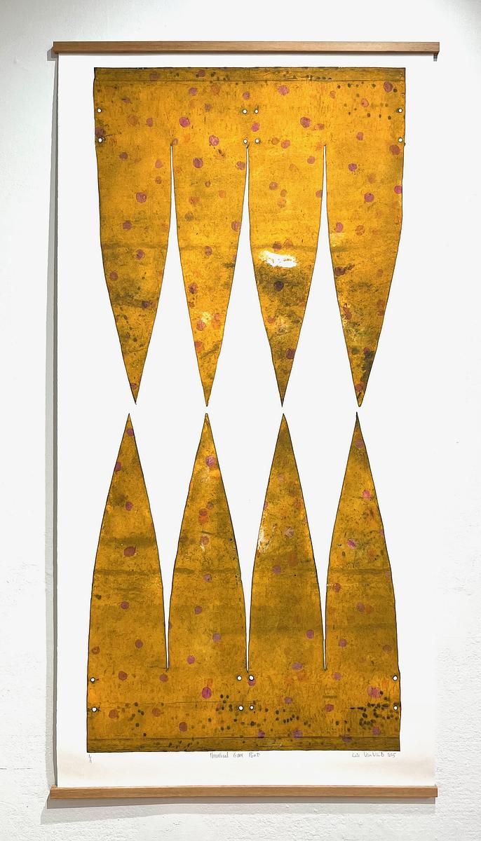 Theoretical gore point takes its name from the insinuated impassible triangle of space where two paths merge or diverge, on what my kids call “The Big Road (the highway).” A gore, additionally, is the cartographical term for a pointed section of a flattened globe, and of course describes the gratuitous destruction of flesh. Theoretical gore point integrates interrelated meanings of the term into an art practice that has been interrupted by the whiplash of contemporary politics. Inspired by the act of mothering during these times, whimsy, play, and color infuse forms of shields, shrouds, and spears. Found and collected materials serve as a catalyst in my practice - graphic elements of etchings and physical building blocks of sculptures and installations.In theoretical gore point, prints made from a single plate explore the multiverse of solutions a found object can have as it becomes “Art.” Using a decommissioned timpani - a copper kettledrum - the goal was to extract its unknown history through prints of the object itself. Traditional intaglio prints complement themes and motifs as they emerge, specifically mapping, mothering, and memory.